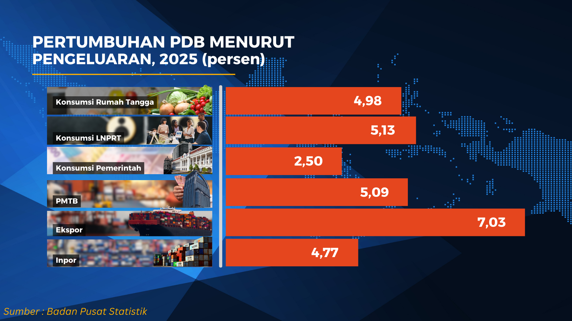 Sementara itu, pertumbuhan tertinggi dari sisi pengeluaran dicapai oleh Komponen Pengeluaran Konsumsi Lembaga Nonprofit yang Melayani Rumah Tangga (PK-LNPRT) sebesar 12,48 persen, diikuti Komponen PK-P sebesar 6,61 persen; Komponen Ekspor Barang dan Jasa sebesar 6,51 persen; Komponen Pengeluaran Konsumsi Rumah Tangga (PK-RT) sebesar 4,94 persen; dan Komponen Pembentukan Modal Tetap Bruto (PMTB) sebesar 4,61 persen. Sementara itu, Komponen Impor Barang dan Jasa (faktor pengurang dalam PDB menurut pengeluaran) tumbuh sebesar 7,95 persen.