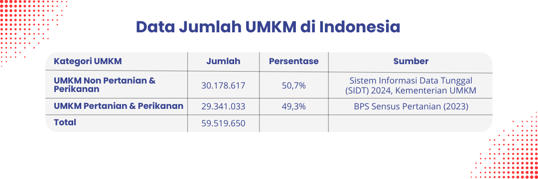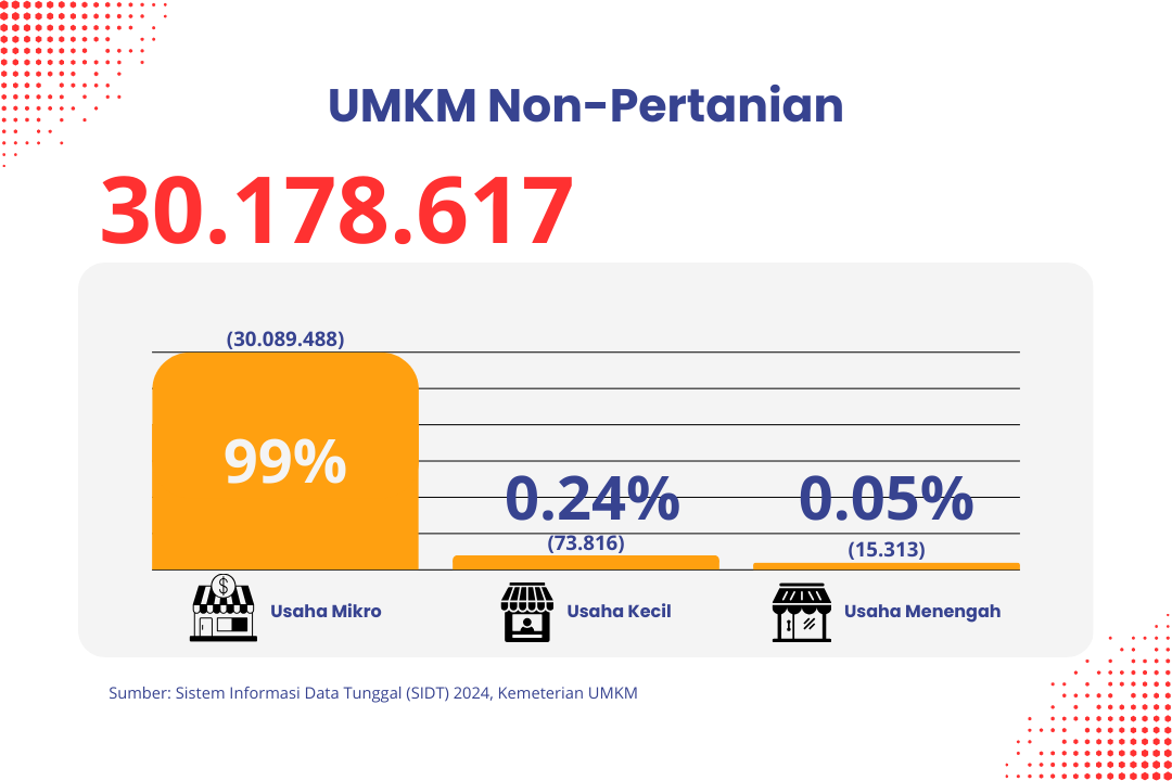Menurut data Kementerian Usaha Mikro Kecil dan Menengah (UMKM), terdapat sekitar 30,18 juta unit UMKM yang tercatat di Indonesia sampai 31 Desember 2024. Namun, jumlah ini belum mencakup UMKM dari sektor usaha pertanian dan perikanan.