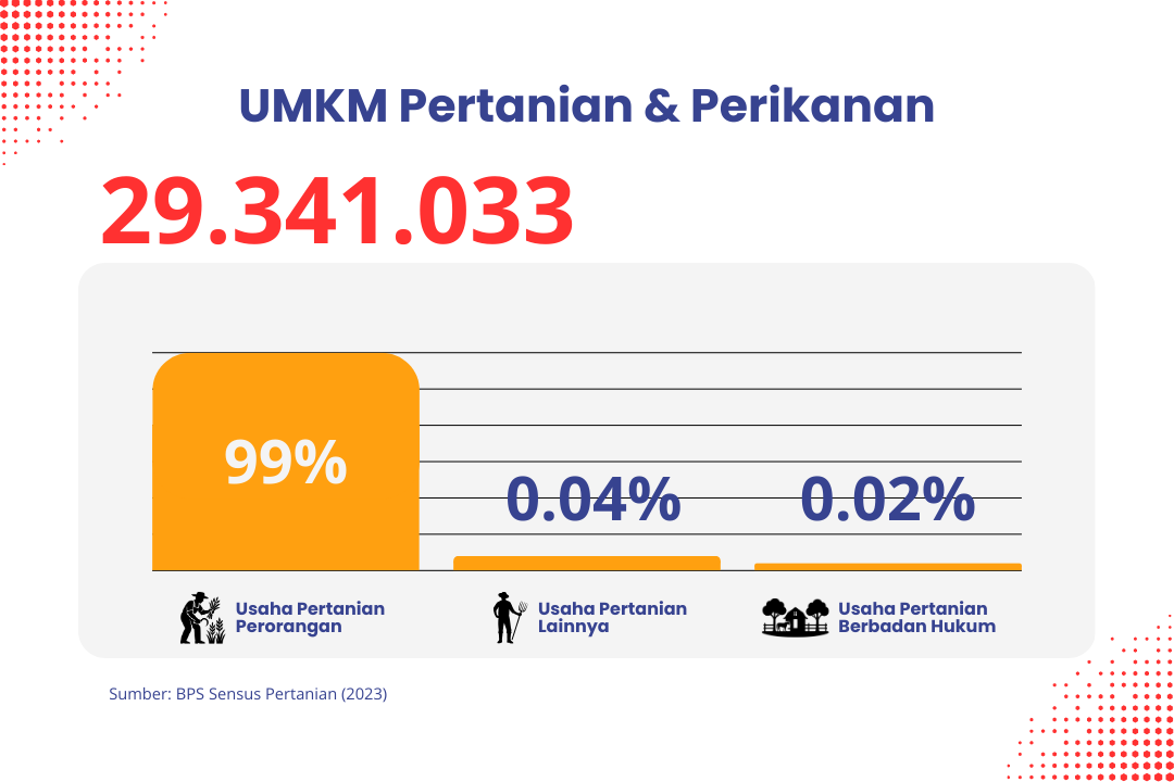 Sementara itu, berdasarkan data dari Badan Pusat Statistik (BPS) Sensus Pertanian 2023, jumlah UMKM Pertanian dan Perikanan mencapai 29.341.033 unit dimana 99% merupakan usaha pertanian perorangan.