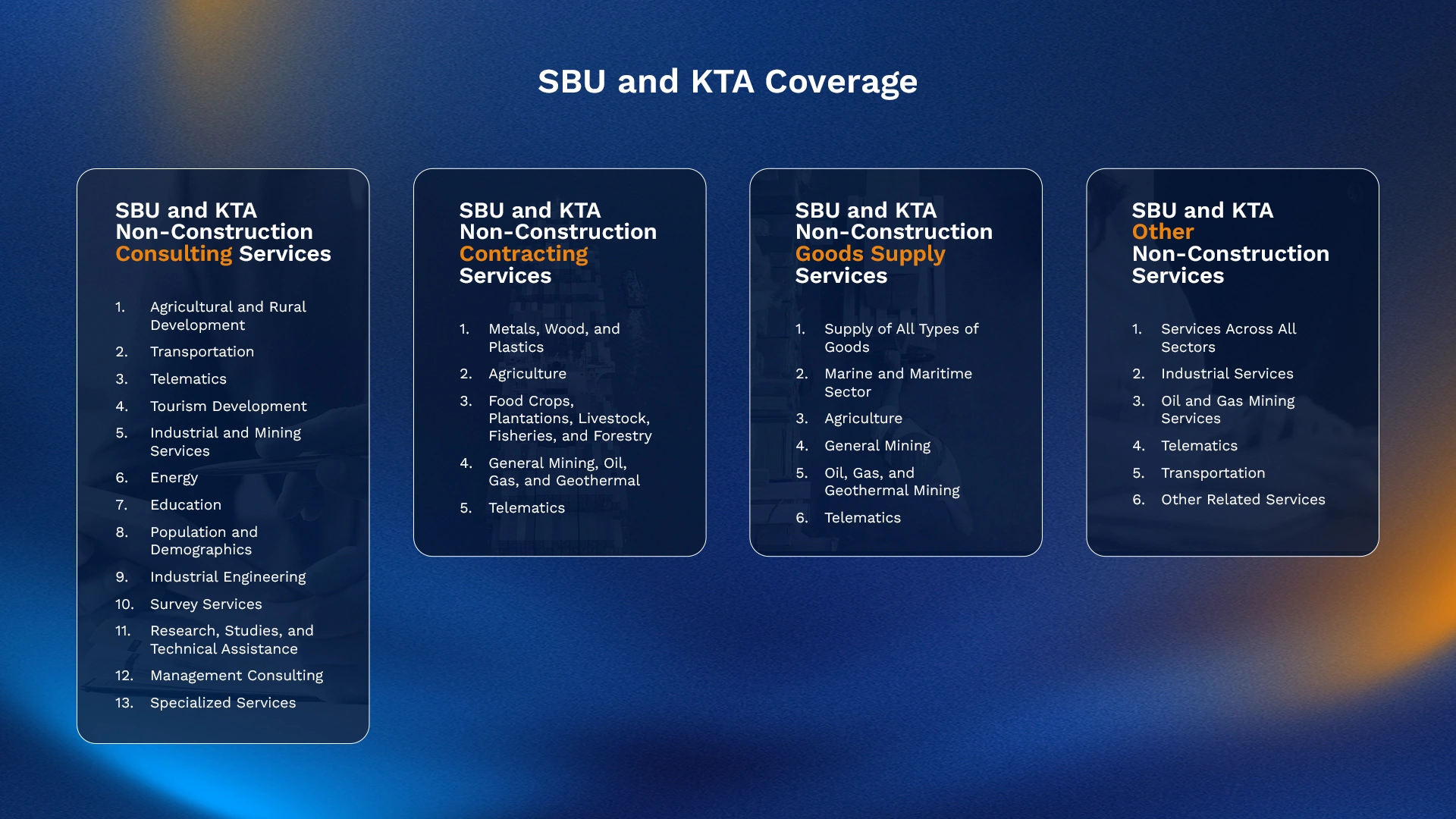 Lengkapi legalitas usaha Anda dengan Kartu Tanda Anggota (KTA), Sertifikat Badan Usaha (SBU) Kompetensi dari Kadin, maupun SBU Non Konstruksi dari Kadin Indonesia.