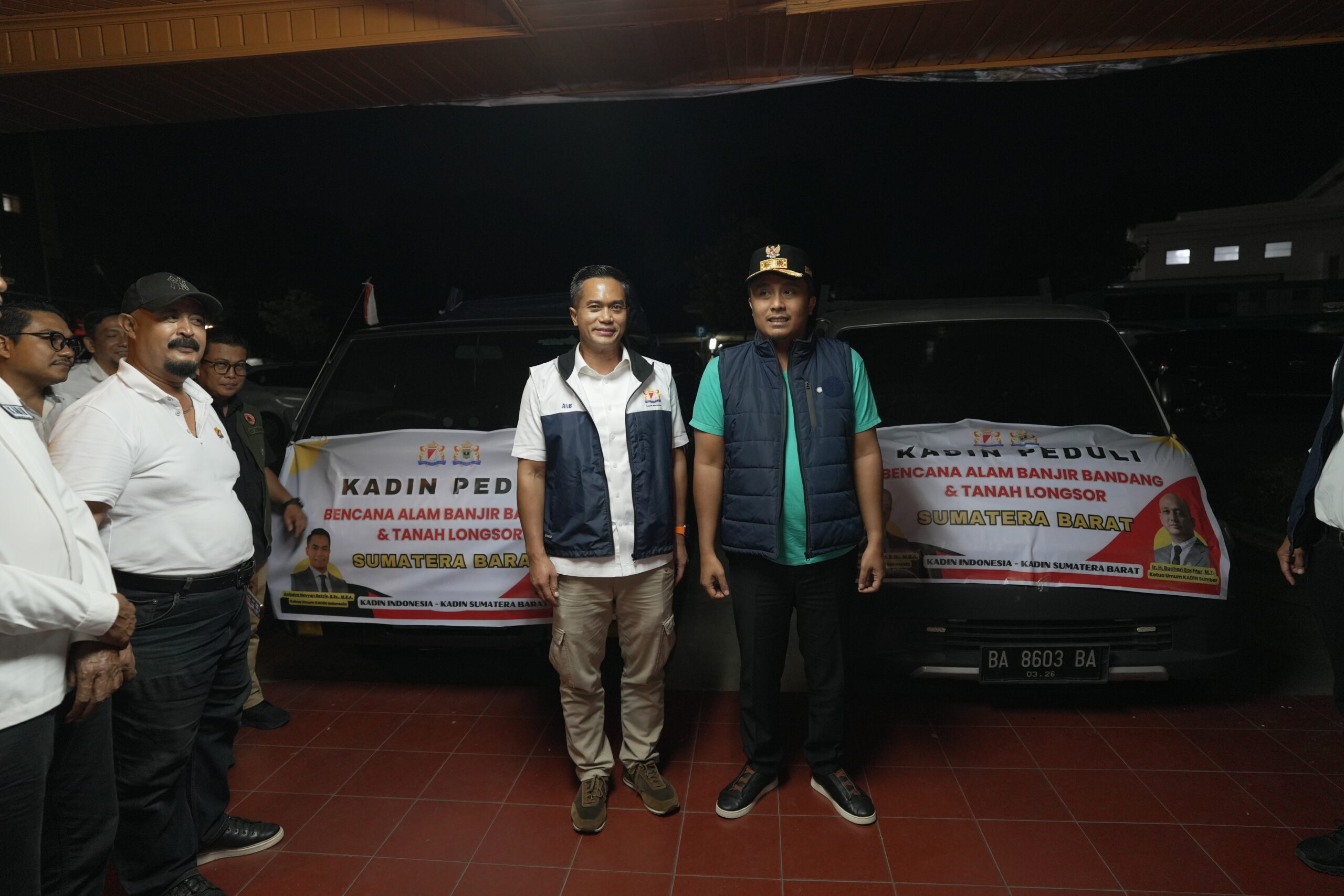 Ketua Umum Kadin Indonesia Anindya Novyan Bakrie menyerahkan bantuan dari Kadin Indonesia dan diterima langsung oleh Wakil Gubernur Provinsi Sumbar Vasko Ruseimy di Posko Terpadu Penanggulangan Darurat Bencana Alam, yang berlokasi di Kantor Gubernur Prov. Sumbar, Padang, Kamis (04/12/2025).