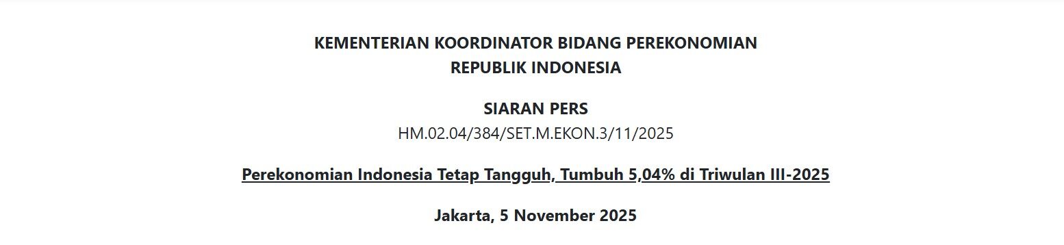 Perekonomian Indonesia kembali menunjukkan ketahanan dan daya saing yang kuat di tengah ketidakpastian global. Berdasarkan data Badan Pusat Statistik (BPS), Produk Domestik Bruto (PDB) Indonesia pada Triwulan III 2025 tumbuh sebesar 5,04% (yoy), tetap berada pada jalur untuk mencapai target pertumbuhan tahunan 5,2%.